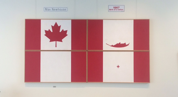 On February 11th, 2015, the Globe and Mail newspaper included a photograph of a one-day installation that artist Maxwell Newhouse presented of his four canvasses titled, FOUR SEASONS OF THE CANADIAN FLAG. Max staged this installation in honour of the 50th anniversary of the Canadian flag. A simple but resonatingly profound concept, the four large canvases of the flag present the central maple leaf of the flag in a state to match each season with "summer" being a full-sized maple leaf, "fall" a withering leaf, "winter" has a completely empty space in the middle and "spring" is but a small bud of a leaf. Max created this work in 1975 to recognize the 10th anniversary of the flag and holds the patent on the images.