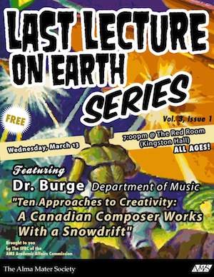 Ten Approaches to Creativity–A Canadian Composer Works with a Snowdrift [Description: In 2012 John Burge was invited by the Queen's University Alma Mater Society to present that year's LAST LECTURE ON EARTH in which a professor gives a single talk on any topic that truly matters to them. Having spent most of his life figuring out how to be creative and how to inspire his own students to pursue their own source of inspiration, "Creativity" seemed an ideal springboard. To personalize the talk, all of the points of discussion find resonance in short excerpts from one of his short orchestral composition entitled, Snowdrift.]